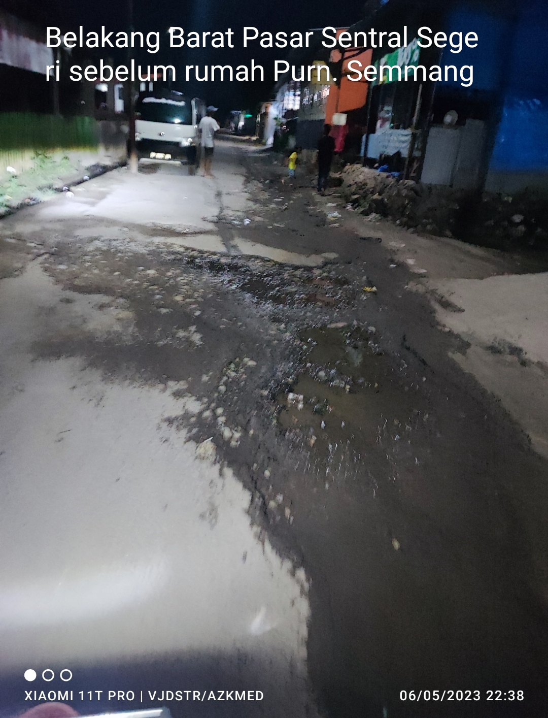 | Keterangan | : | 1. Lokasi Jalan Rusak di Lorong Masuk menuju Belakang Pasar Sentral Segeri Jalan samping Rumah Toko HANE MART menuju ke belakang 2. Lokasi Tepat Sebelah Timur Pasar Sentral Segeri 3. Lokasi Tepat di sudut Belakang Pasar Sentral Segeri Harap Perhatian Pemerintah untuk Kemudahan Akses Keluar Masuk masyarakat Pasar dan Kemudahan Aktivitas Harian Warga Sekitar Pasar Segeri, Wassalam ???????????? |